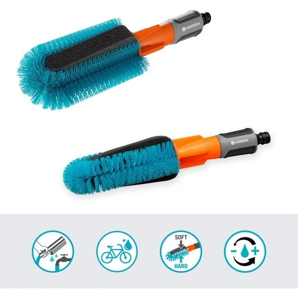 Die Cleansystem Fahrradbürste von GARDENA eignet sich zum gründlichen und schonenden Reinigen von Fahrrädern, E-Bikes, Fahrradanhängern oder Kinderwagen. Die Borsten dienen zum Reinigen des Rahmens, der austauschbare Schwamm säubert empfindliche Oberflächen wie die Speichen. Die Wasserzufuhr kann stufenlos reguliert oder auch komplett abgestellt werden. Das GARDENA Cleansystem ist die ideale Lösung für alle Reinigungsaufgaben rund um Haus und Garten. Das wasserführende Reinigungssystem mit dem Original GARDENA System-Anschluss ist vielseitig kombinierbar. Es besteht aus verschiedenen Handbürsten für den Einsatz auf kleineren Flächen und Stielen mit passenden Vorsatzgeräten, wenn mehr Reichweite benötigt wird oder die zu reinigende Fläche größer ist. Der Wasserdurchfluss ist stufenlos regulierbar, und die Nasspflege kann mit klarem Wasser oder unter Zusatz von GARDENA Reinigungstabs oder GARDENA Seifenstäbchen erledigt werden.Art.-Nr.: 100025438