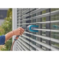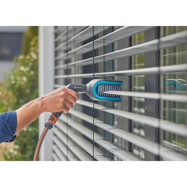 Die Cleansystem Jalousienbürste von GARDENA befreit dank der Form und Anordnung der Borsten Jalousien mit C- oder Z-Lamellen im Außenbereich spielend leicht von Staub und Schmutz. Die Borsten umfassen die Lamellen, Wasser von der Ober- und Unterseite sorgt für eine gründliche Reinigung in einem Arbeitsgang. Der Bürstenkopf lässt sich beidseitig um 90° drehen, so können auch tiefer liegende Lamellen noch bequem gereinigt werden. Das GARDENA Cleansystem ist die ideale Lösung für alle Reinigungsaufgaben rund um Haus und Garten. Das wasserführende Reinigungssystem mit dem Original GARDENA System-Anschluss ist vielseitig kombinierbar. Es besteht aus verschiedenen Handbürsten für den Einsatz auf kleineren Flächen und Stielen mit passenden Vorsatzgeräten, wenn mehr Reichweite benötigt wird oder die zu reinigende Fläche größer ist. Die Nasspflege kann mit klarem Wasser oder unter Zusatz von GARDENA Reinigungstabs oder GARDENA Seifenstäbchen erledigt werden.Art.-Nr.: 100025449