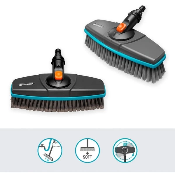 Die Cleansystem Stielbürste soft 18810-20 von GARDENA eignet sich zur Reinigung von größeren, empfindlichen Flächen, z.B. Wintergärten oder Gewächshäusern. Der Stiel ist in 30°-Stufen rundum drehbar, für müheloses Arbeiten und ideale Anpassung an die jeweils zu reinigende Fläche, und die umlaufende Weichkunststoffleiste verhindert Kratzspuren. Die Stielbürste soft ist mit allen GARDENA Cleansystem Wasserstielen kompatibel. Das GARDENA Cleansystem ist die ideale Lösung für alle Reinigungsaufgaben rund um Haus und Garten. Das wasserführende Reinigungssystem mit dem Original GARDENA System-Anschluss ist vielseitig kombinierbar. Es besteht aus verschiedenen Handbürsten für den Einsatz auf kleineren Flächen und Stielen mit passenden Vorsatzgeräten, wenn mehr Reichweite benötigt wird oder die zu reinigende Fläche größer ist. Der Wasserdurchfluss ist stufenlos regulierbar, und die Nasspflege kann mit klarem Wasser oder unter Zusatz von GARDENA Reinigungstabs oder GARDENA Seifenstäbchen erledigt werden.Art.-Nr.: 100025293
