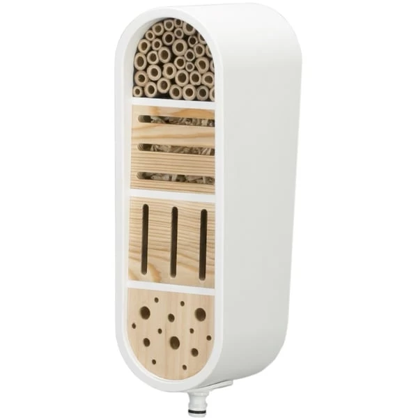 Das GARDENA ClickUp! Insektenhotel bietet eine Nist- und Überwinterungshilfe für nützliche Insekten, es bietet vier artgerechte Lebensräume für unterschiedliche Insekten wie Wildbienen, Schmetterlinge und Marienkäfer. Viele Insekten finden in ihrem natürlichen Lebensraum keine zuverlässige Nist- und Überwinterungsstelle mehr. Das ClickUp! Insektenhotel im Garten ist eine sichere und ästhetische Zuflucht und ein geschütztes Zuhause für die heimische Artenvielfalt. Das Insektenhotel ist mit einer Füllung aus FSC-zertifiziertem Holz versehen, der Rahmen um die einzelnen Bereiche bietet Schutz vor der Witterung. Das GARDENA ClickUp! Insektenhotel ist zur Verwendung mit dem GARDENA ClickUp! Stiel vorgesehen, auf dem es sich mit einem Klick wackelfrei befestigen lässt. Es ist nachhaltig lackiert und frostsicher.Art.-Nr.: 1687404